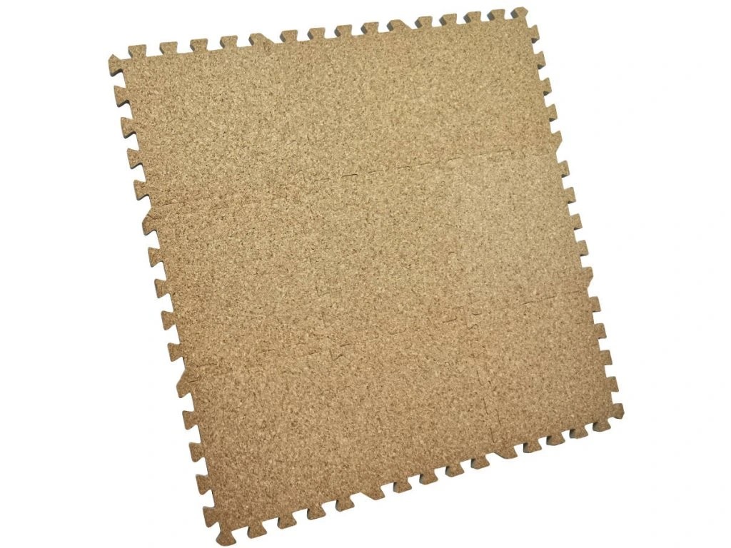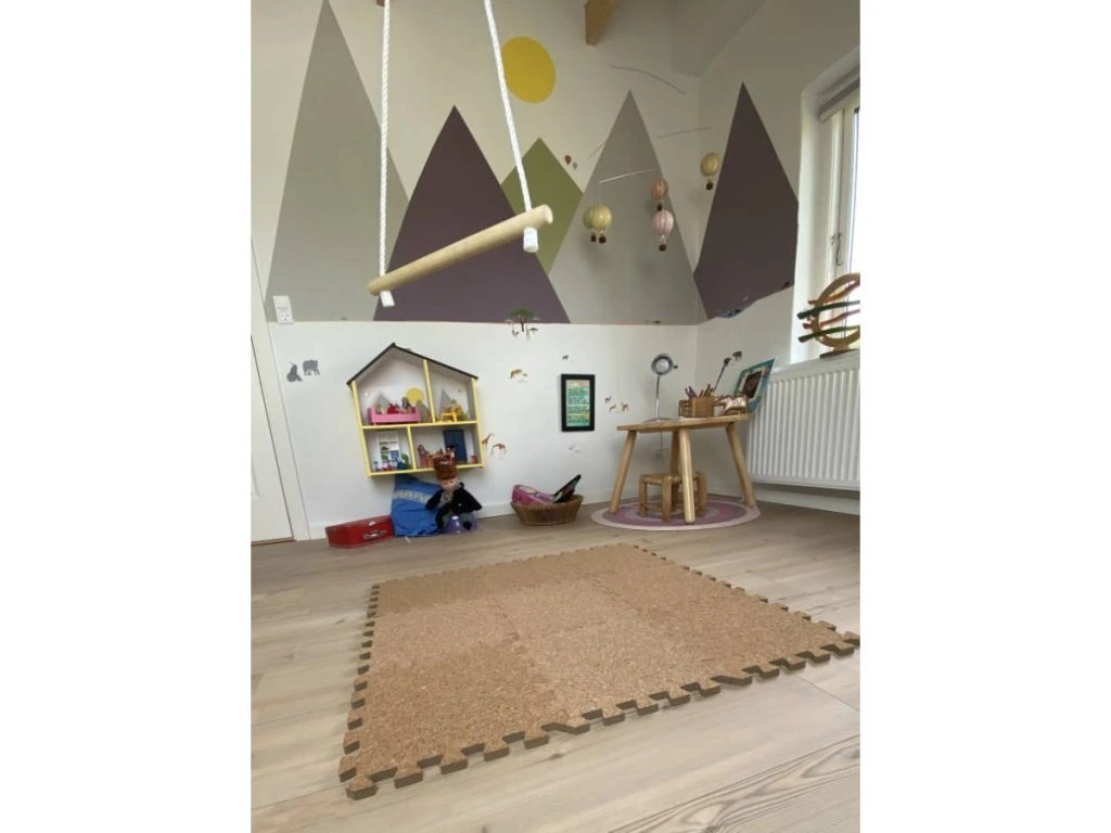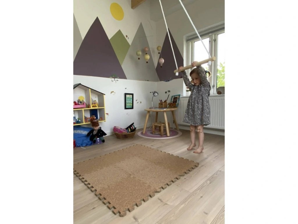 Vynikající pěnová puzzle hrací podlaha od Baby Danu s korkovým povrchem, která působí v interiéru velmi přirozeně.