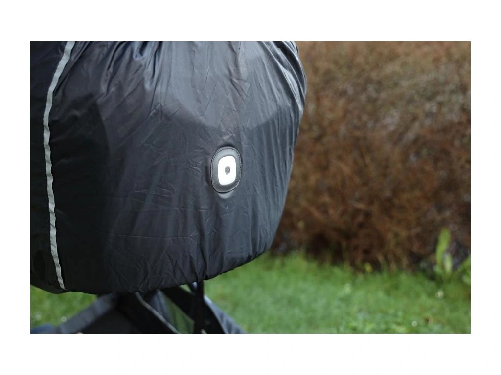 V zimních měsících je pláštěnka s LED osvětlením naprosto nezbytným doplňkem každého kočárku. Tato pláštěnka je vhodná zejména pro krátké zimní dny, protože má LED světlo i odrazku, takže jste vy i kočárek vidět. Skvěle se hodí také pro večerní nebo brzké ranní výlety. LED světlo může svítit jasným bílým světlem nebo blikat jasným červeným světlem. Můžete jej nabíjet pomocí USB konektoru, který se hodí k vaší nabíječce mobilního telefonu a počítači. Na vnitřní straně pláštěnky je našita taška, do které pláštěnku snadno sbalíte a uložíte na rukojeti. Pláštěnka pasuje na většinu typů kočárků.