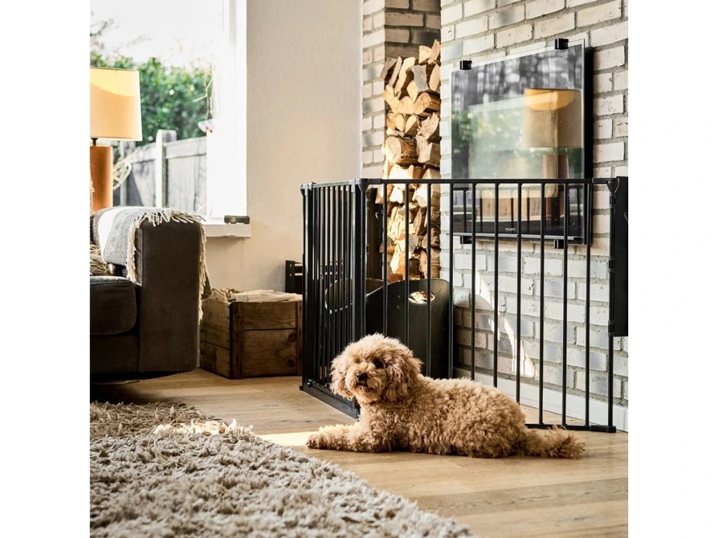 Dveřní část u branky DogSpace Max je mimořádně široká a při sestavování ji můžete umístit, kamkoli budete chtít. Uprostřed nebo na jednu ze stran. To záleží jen na vás. Dvířka se snadno otevírají jednou rukou (ale ne tlapkami) a otevírají se oběma směry.
