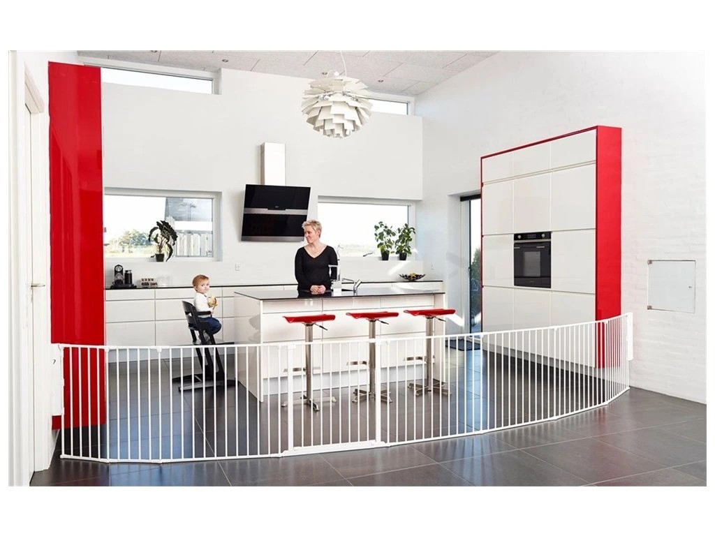 Parametry, normy, technické údaje: - Odpovídá chemickému testu EN 71–3. - Čistá hmotnost 11,6 kg - Výška zábrany 71 cm - Pro minimální otvor 90 cm - Pro maximální otvor 350 cm - Vyrobeno z kovu. - Barva bílá. - Vyhovuje nové normě EN 1930:2011 - vzdálenost mezi šprušlemi 5,5cm - Made in Denmark. Rozměry balení: 78 x 78 x 12 cm.